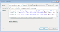 - In the Preferences dialogue, go to Web » JSP Files » Editor » Templates and click New. Enter name New JavaServer Faces (JSF) Page (HTML5), select context New JSP, enter description JSF with HTML5 markup and default view setup, copypaste the following snippet in the pattern field and click OK: