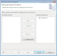 - Rightclick the Tomcat server entry in the Servers tab and choose Add and Remove Projects. In the wizard, select the Playground project under Available Projects and click Add to add it to Configured Projects. Click Finish.
