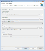 - In the wizard, give it the Project name Playground, verify if Target Runtime is set to Apache Tomcat v6.0 and Dynamic Web Module version is set to 2.5. Under Configuration select JavaServer Faces v1.2 project and click Next.