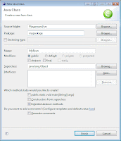 - Enter the package name mypackage, enter the class name MyBean, keep the other fields default and click Finish. The package and the class will be created and the editor box will show the class source.