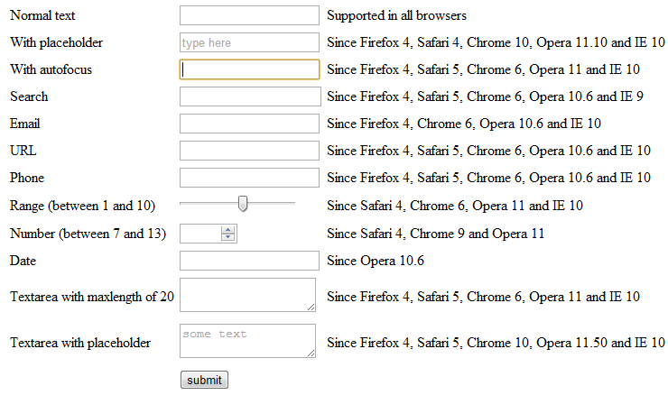 For OmniFaces I've recently looked for the least intrusive way (i.e. no custom component/tag/renderer boilerplate necessary) to add HTML5 specific <form>, <input>, <textarea> and <select> attributes like placeholder, autofocus, type="range", etcetera. You can learn about all of those new HTML5 attributes in html5tutorial.info under the section "Web Form 2.0". The JSF renderers by default ignores all attributes which are not officially supported by the components.