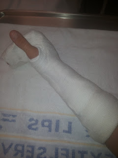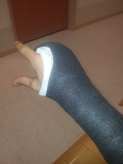 Now my entire right hand, except the thumb, is in a 90 degrees position in plaster cast, in a sock puppet position.