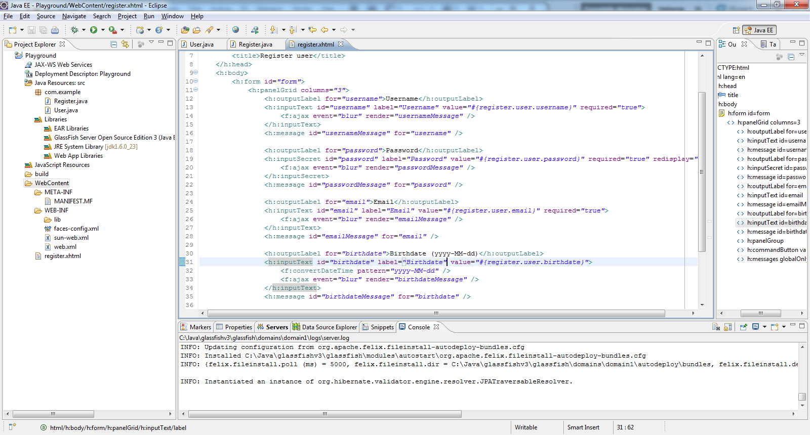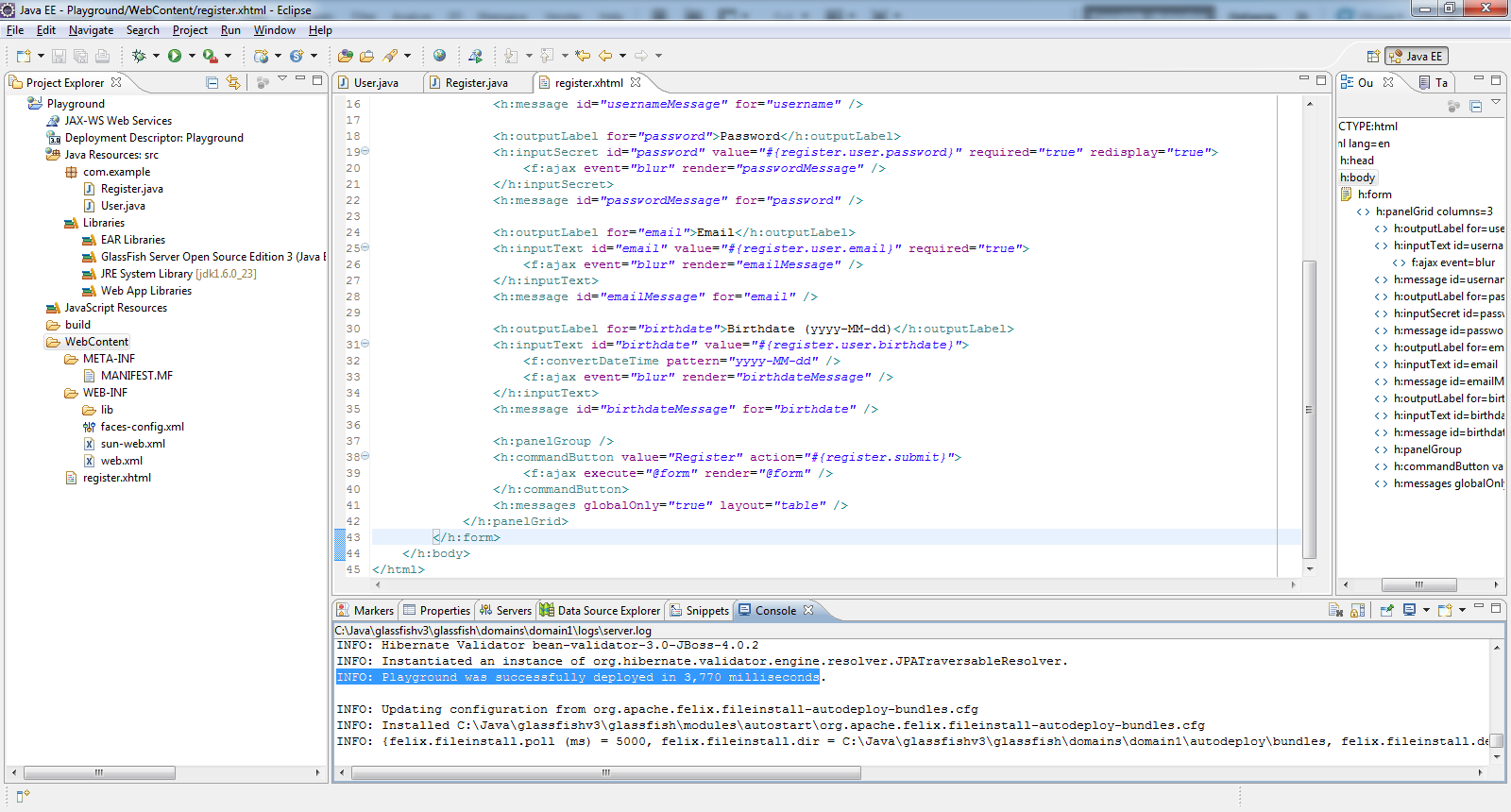 Edit it accordingly in the register.xhtml, save it and refresh the page (no server restart is required! Glassfish hotdeploys extremely fast, you don't need to wait for anything, just refresh the page in browser). Trigger the validation and you'll see form:username, form:password, etc instead.