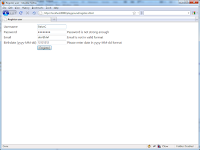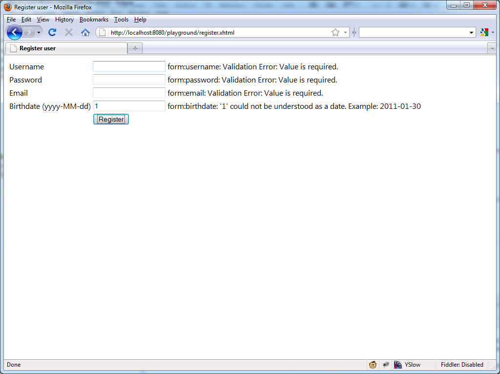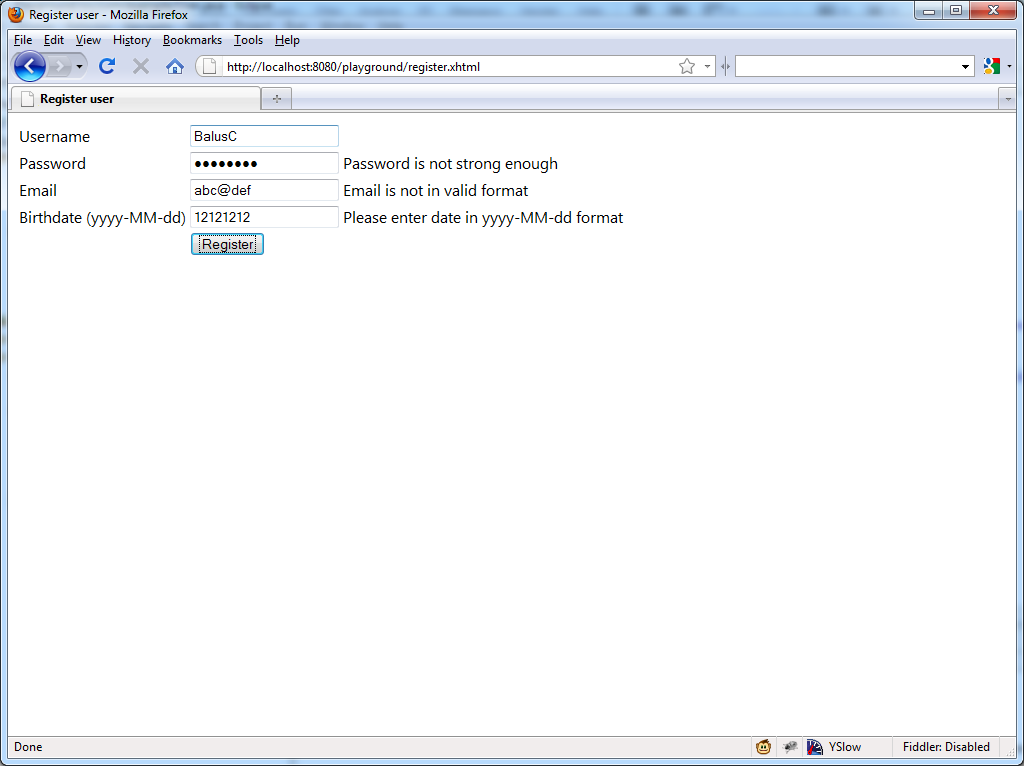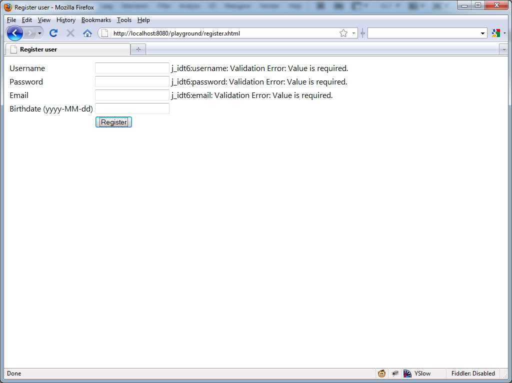 4. Play around it in your browser! Tab through the fields, enter values, remove values, press the submit button, etcetera. You'll note that it's running smoothly thanks to all the new JSF 2.0 ajax works.