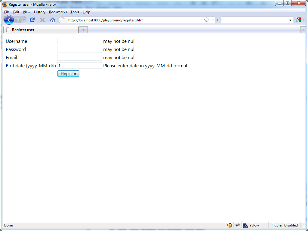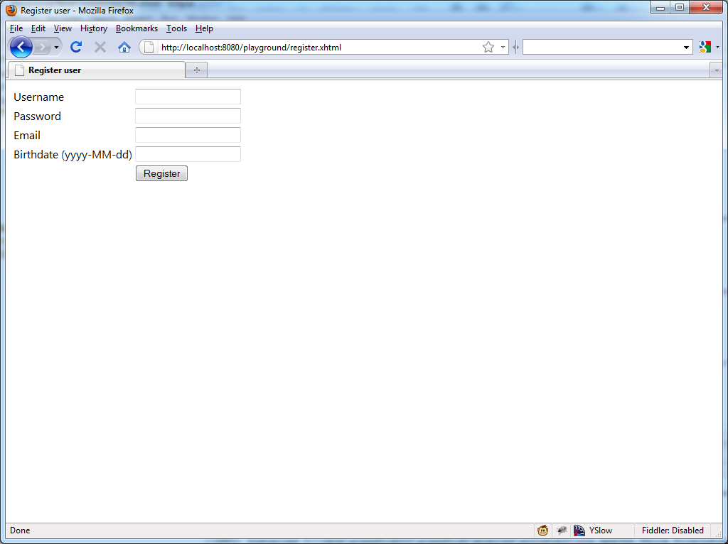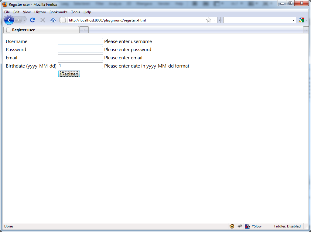 3. Once it is started, go to http://localhost:8080/playground/register.xhtml in your favourite webbrowser. Note that the .xhtml extension must match the URL pattern of the FacesServlet mapping as we have definied in step 4 of chapter Prepare JSF web project in Eclipse. Such a request URL will then trigger the FacesServlet and it will create the FacesContext and do all the JSF works.