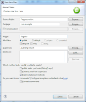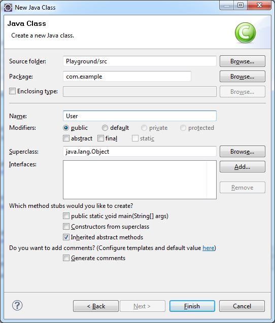 1. Open the newly created Playground project, rightclick at Java Resources folder and choose New » Class. In the wizard, enter the package name com.example, enter the class name User, keep the other fields default and click Finish. The package and the class will be created and the editor box will show the class source.