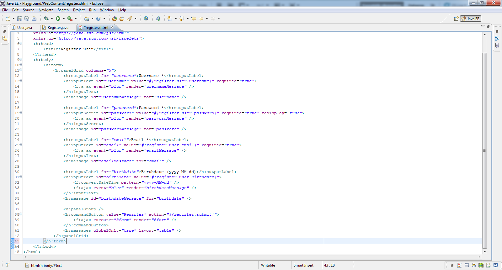 You see, it creates a form with a 3-column table (however, a tableless form with a flood of CSS would semantically have been more correct, but that's beyond the scope of this tutorial, we teach JSF, not CSS). The 1st column contains the labels for input fields, the 2nd column contains the input fields and the submit button, the 3rd column contains the messages. The <f:ajax> tags in the input fields will submit (and validate!) only the current field and trigger a re-render of the associated message field when the JavaScript/HTML DOM blur event is triggered (when the field loses focus, i.e. when you tab out the field or click somewhere else on the page). The <f:ajax> tag in the command button will do a pure ajax submit instead of a normal submit. The globalOnly="true" in the messages field will only display messages whose client ID is null (as we've created in the managed bean's submit() method).