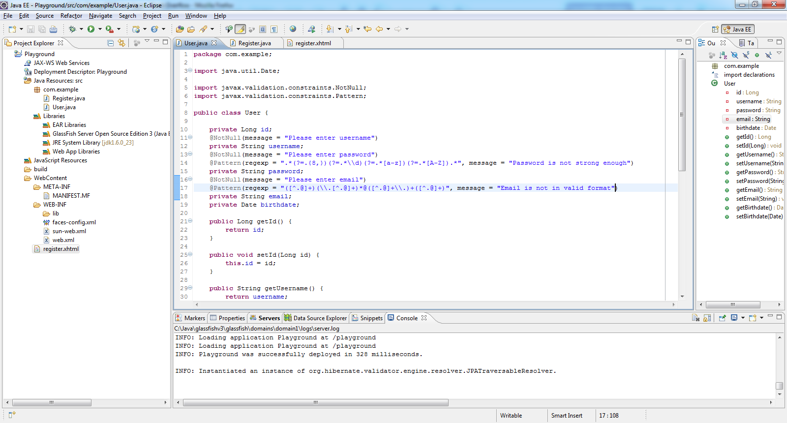 As a hello world project, we'll create a simple ajax-flavored form which treats the use case of "Register User". We first need to create a data model. That's a class which represents a real world entitiy, in this case the User. It holds all the information about the user. It should be written as a Javabean. A Javabean is a class which holds properties as private fields which are exposed by public getters and setters.