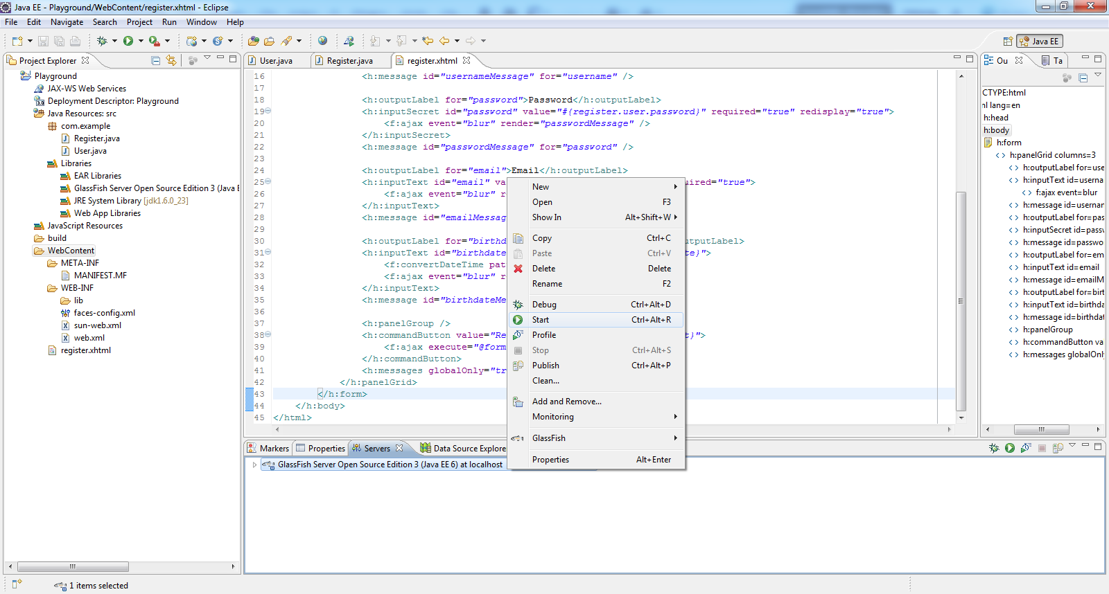 1. Rightclick the Glassfish server entry in the Servers tab and choose Add and Remove Projects. In the wizard, select the Playground project under Available Projects and click Add to add it to Configured Projects. Click Finish.